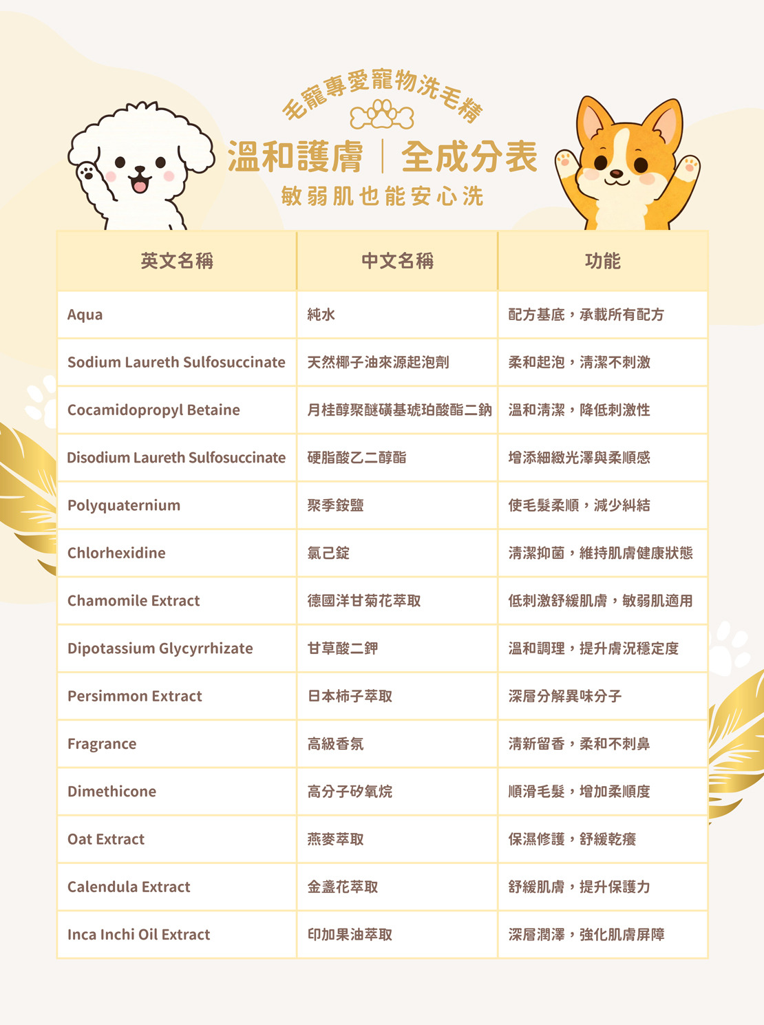 •使用方法: 用溫水將寵物全身毛髮濕潤,取適量洗毛精於掌心簡單起泡,塗抹在寵物身體各部位,並避開眼睛、口鼻、耳溝,輕柔按摩,再用溫水沖淨即可(建議重複一次效果為佳)。